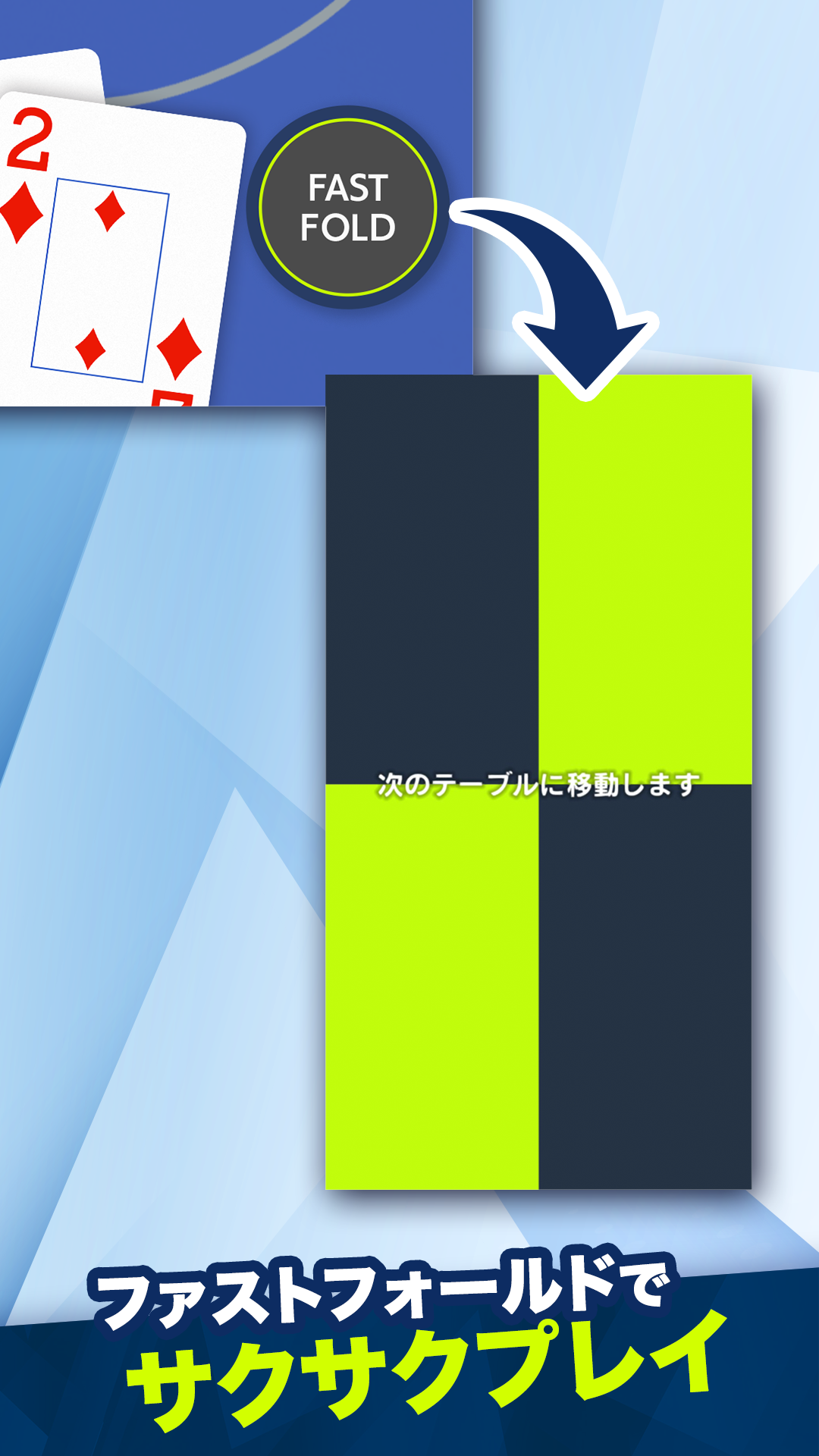 本格的な雰囲気を損なわず、誰でも直感的に操作できるUIを実現。ゲームを降りるとすぐに次のテーブルへ移動できる「ファストフォールド」機能は、待ち時間をなくしたテンポの良いプレイ体験を叶えてくれます。